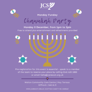 Join us for a community Chanukah Party next Monday, 8 December, from 1 to 3pm as part of JCS Monday Funday. It is free to attend, with entertainment and refreshments included.