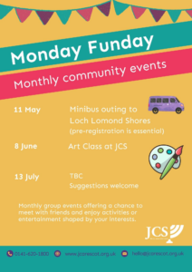Monday 11 May Minibus outing to Loch Lomond Shores – Pre-registration is essential and places are limited. Call us on 0141 620 1800 or email comms@jcarescot.org.uk to secure your space. Please note that there will be no JCS Support Workers available during this outing.